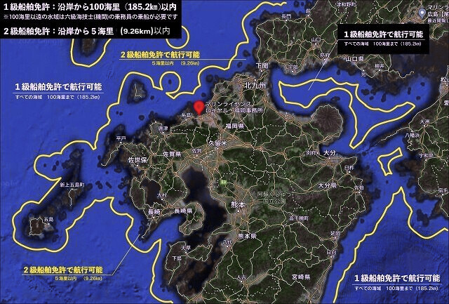 海岸から黄色の線までが5海里(9.26km)で「2級船舶免許」で航行可能なエリアで、1級船舶免許で航行可能なエリアは沿岸から100海里までとなります。
