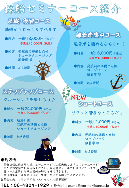 マリンライセンスロイヤル大阪では免許取得後の操船の不安を取り除くためにオーダーメイドの操船セミナーを開催しております。