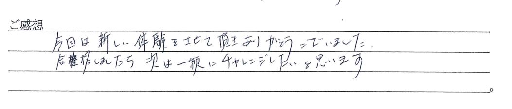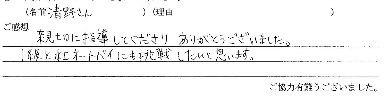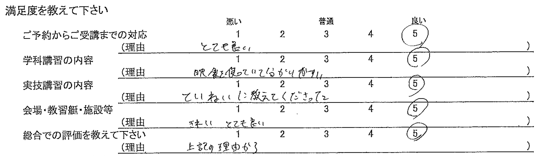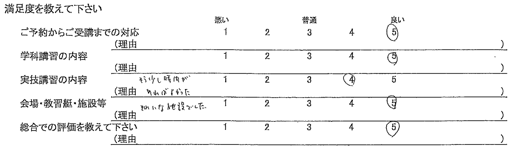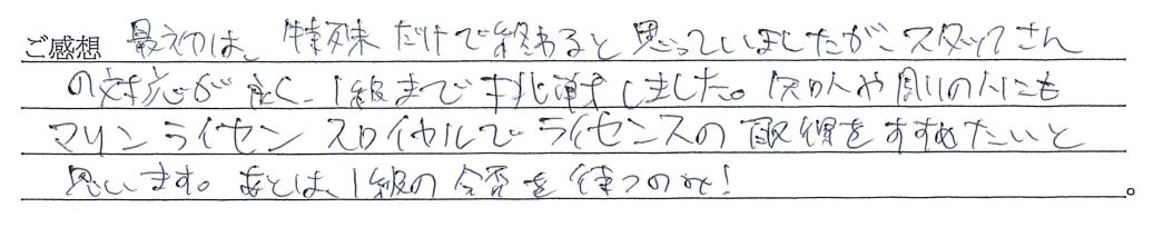2級船舶免許・合格おめでとうございます。 更に満点評価にも感謝いたします。ご感想ご記入頂きましたようにぜひ「1級船舶免許」「水上バイク免許」の取得・チャレンジお待ちしております。2級船舶免許取得後の1級へのチャレンジは学科のみで、「進級STEPUP]でお申込みください。 |