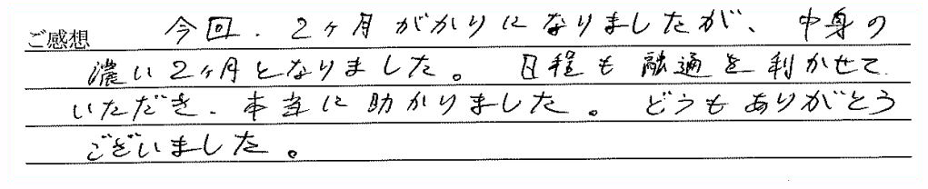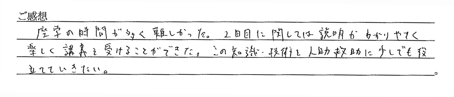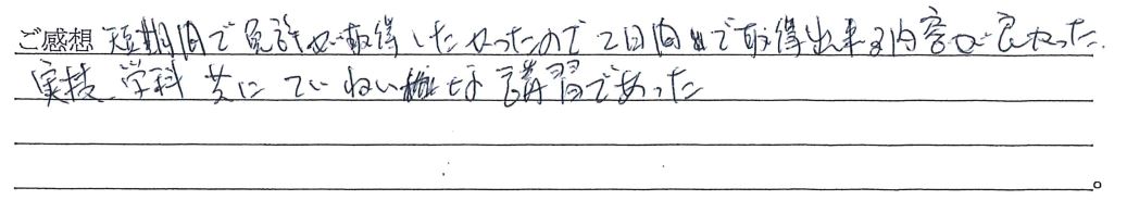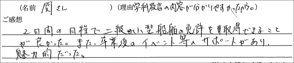 この度は2級船舶免許・合格おめでとうございます。ご感想にもございます「短期間で取得したかった」とございます、当校では「国家試験免除」で日程自由。さらには2日間コースがあり良かったです。学科も実技も講習が丁寧との評価も併せて御礼申し上げます。 |