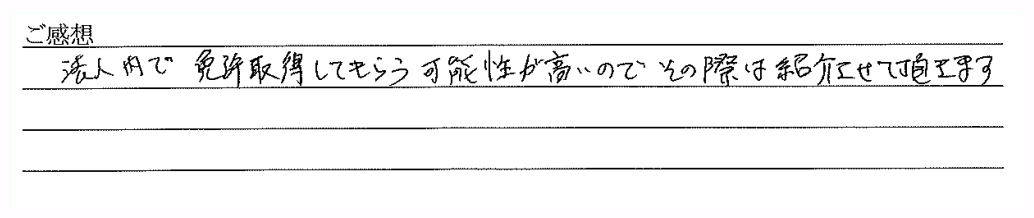 この度は船舶免許取得ならびに合格おめでとうございます。掛田講師は当社1番人気です。ぜひとも社員の皆様にも視野を広げて頂くためにもご受講のご検討よろしくお願いいたします。 |