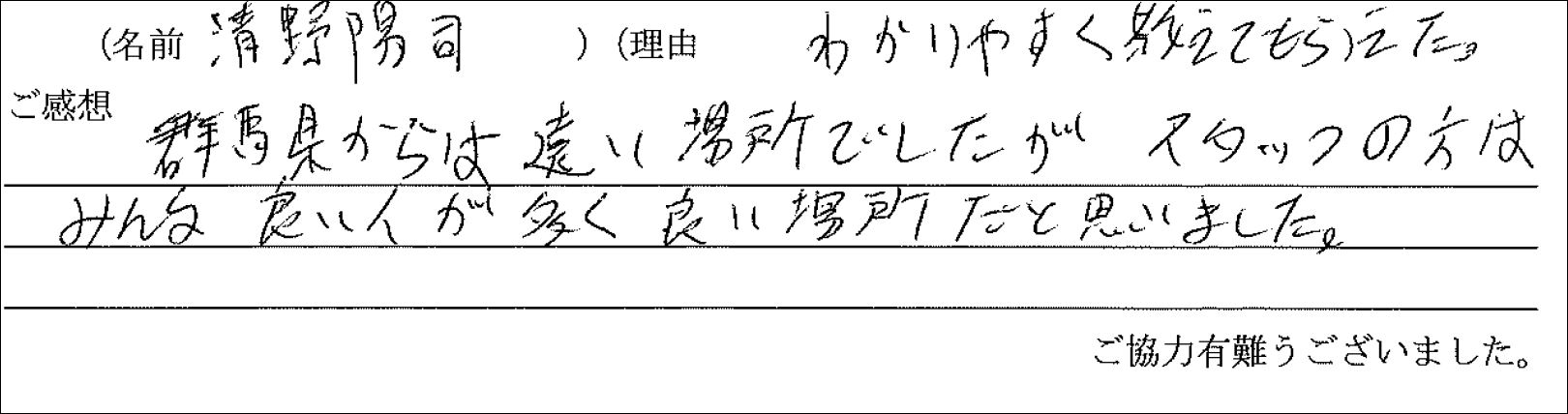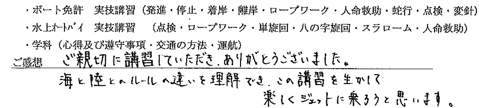 水上バイク(特殊小型船舶免許)合格おめでとうございます。 楽しく受講されたという事でお褒めのお言葉ありがとうございます。またご指摘を頂きました、教習会場までの距離につきましては、出来る限りお客様の地元ご近所で教習が可能になるように地域のマリーナ様との提携も進めてまいります。貴重なご意見ありがとうございました。 |