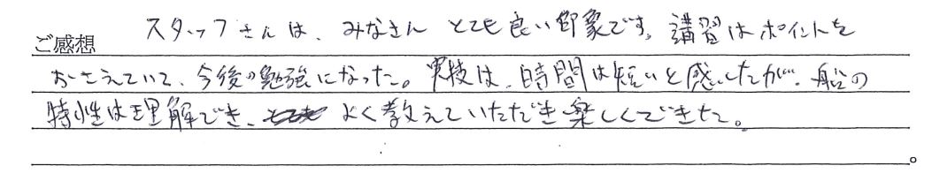 この度は船舶免許ご受講頂き、そして合格おめでとうございます。さらに楽しく受講して頂けた感じで感謝しております。ぜひお友達のご紹介お待ち申し上げております。 |