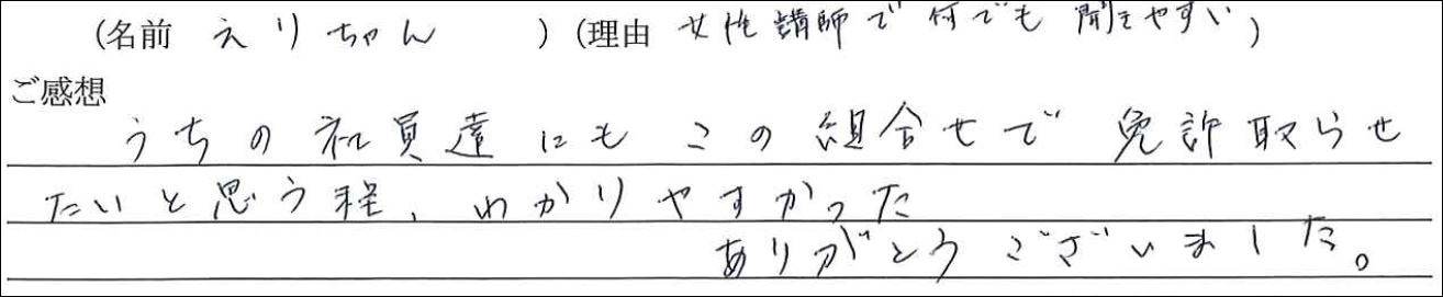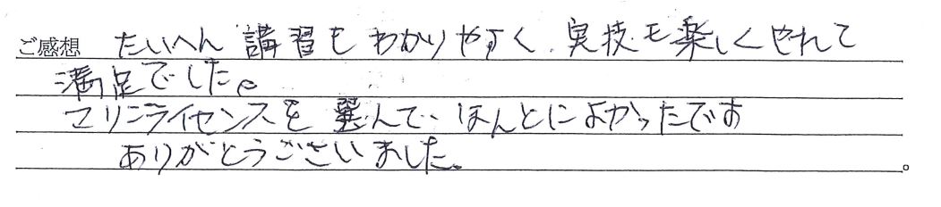 免許取得おめでとうございます。『教習所』と言うと、堅苦しいイメージがあるかもしれません。しかしながら弊社の講師陣は、試験に受かる授業をするのではなく海で遊ぶための役立つ知識をご提供できるよう心掛けております。経験豊富な講師陣だからこその分かりやすい授業で、楽しみながらご受講頂けます。お褒めのお言葉ありがとうございます。 |