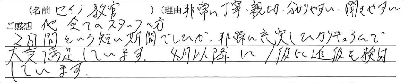 2級船舶免許取得おめでとうございます。満点評価ありがとうございます!学科講習楽しすぎて話しがそれるという点はありませんでしたか?日常ではあまり聞きなれな船舶免許の専門用語、楽しくしないとみなさん眠たくなってしまいますので・・・っと講師のみんなも日々鍛錬積んでます。本当に楽しく受講して頂きありがとうございました、次は1級目指してみませんか? |