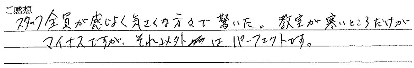 2級船舶免許合格おめでとうございます。船舶免許というと講師がごつごつしているイメージがありますが、当校はイケメン美女ぞろいです。 教室が少し寒かったとのこと、申し訳ございません。確かに座る位置によって差があります。 |